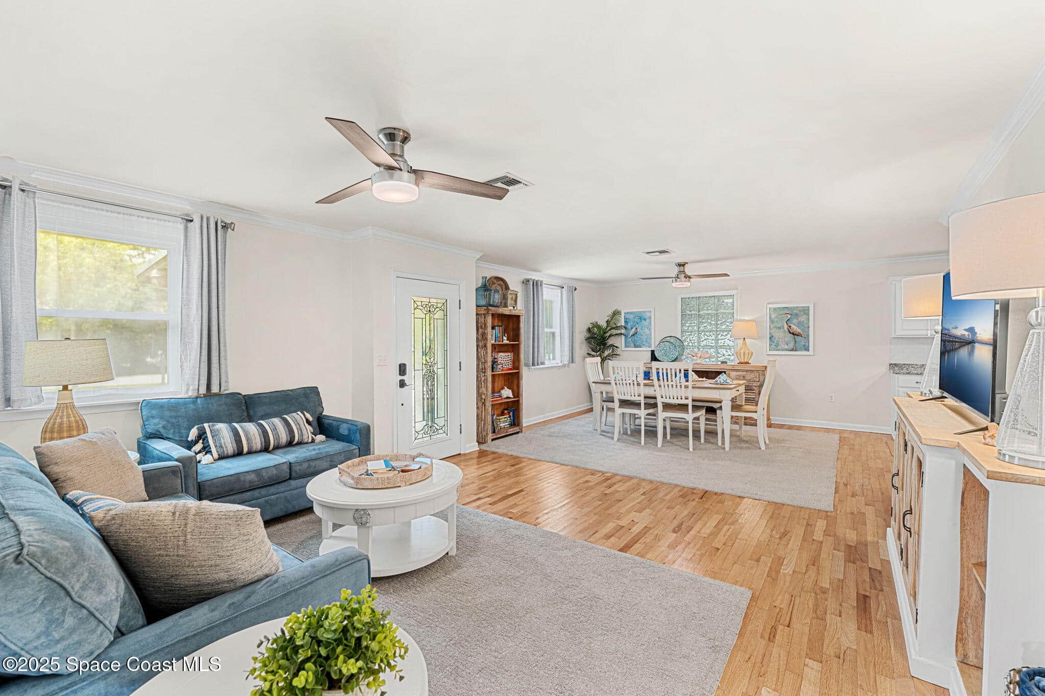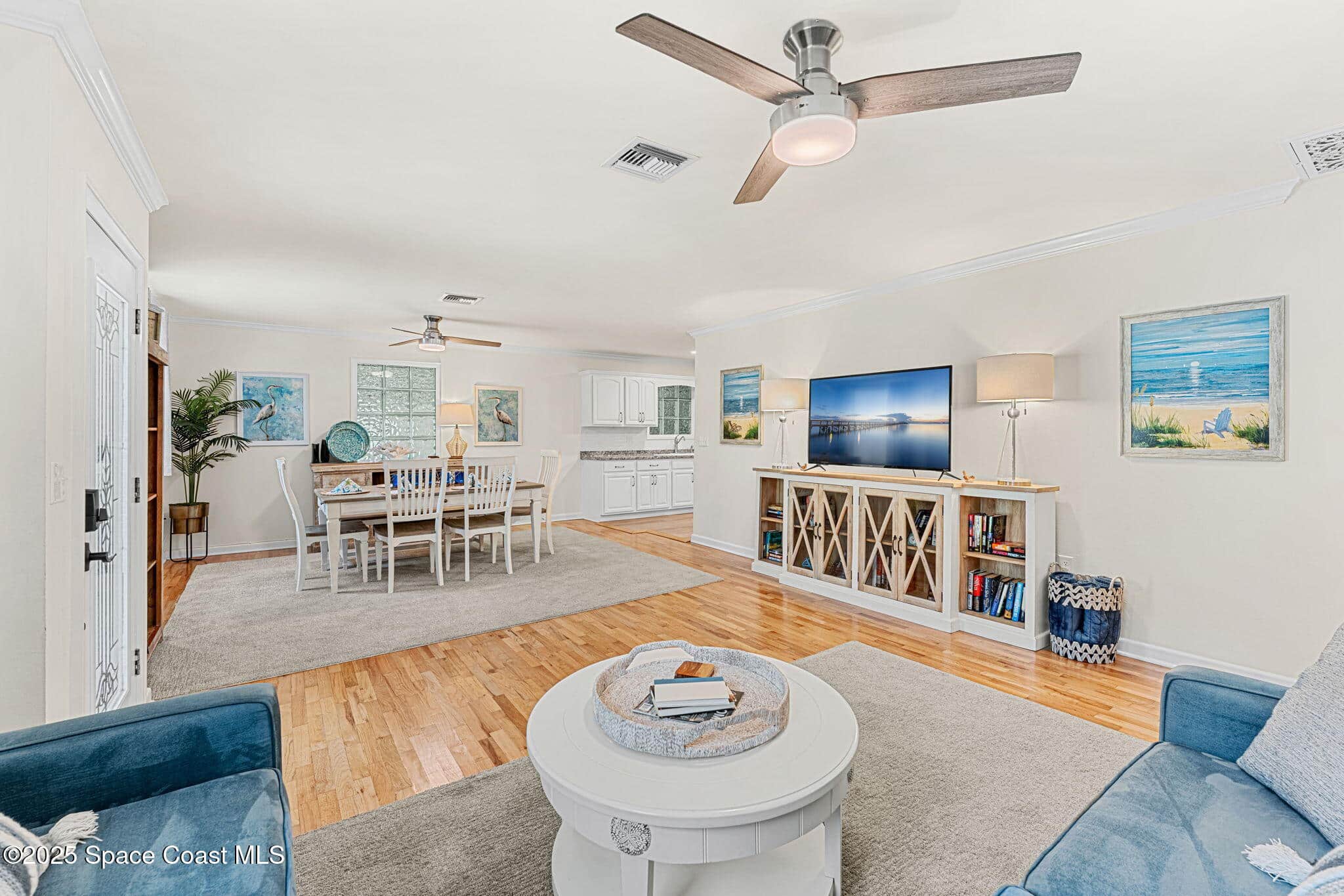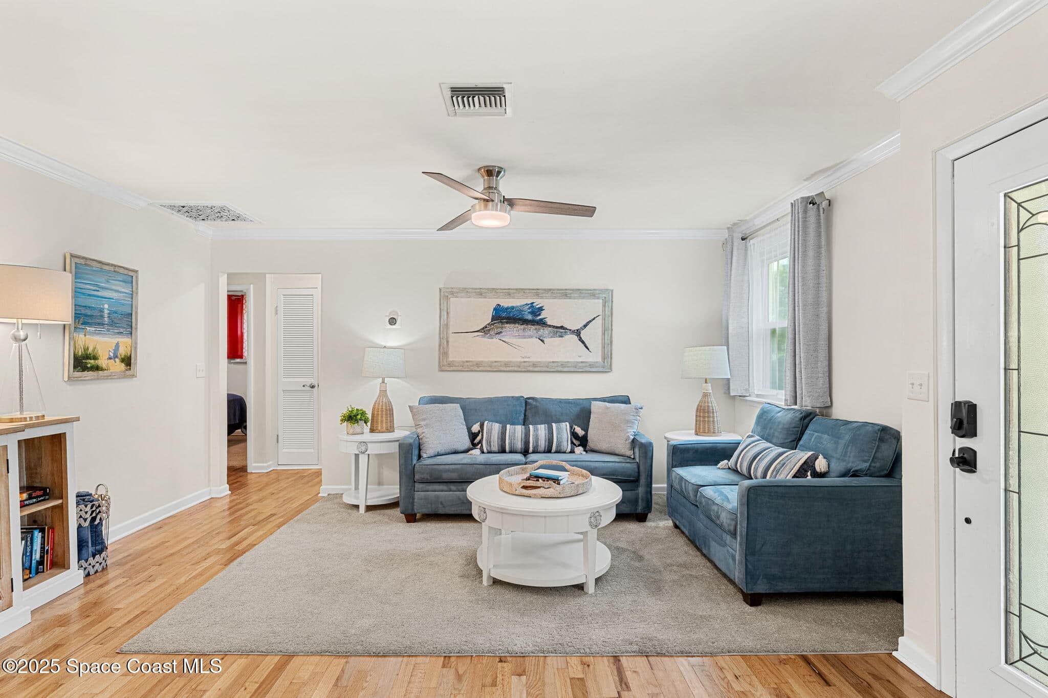 Beautifully renovated and fully furnished, this charming 4BD/2BA home rests on a spacious .52-acre lot w/ the unique opportunity to split the lot and construct an additional residence. Surveys on hand and city approval on setbacks! Loaded w/ updates, Incld crown molding, hardwood pine floors, and impact-rated windows! White cabinetry, SS appliances-2 yrs old, a gas cooktop & a stylish tile backsplash adorn the spacious kitchen. Updated Bathrooms! This split floor plan features a generous back patio, complete w/ a hot tub, perfect for unwinding. The fully fenced yard w/ natural foliage, space for RV/boat parking, plus a large metal shed w/ electricity. Major systems are updated w/ a Nest thermostat, Metal Roof- 2021, HVAC-2025, W/H- 2025 & New Septic System coming in August. 2025. No rental restrictions & the potential to separate the lots and build another home is HUGE! Prime Melbourne location minutes to I-95, Melbourne Int Airport, major employers & beaches!
