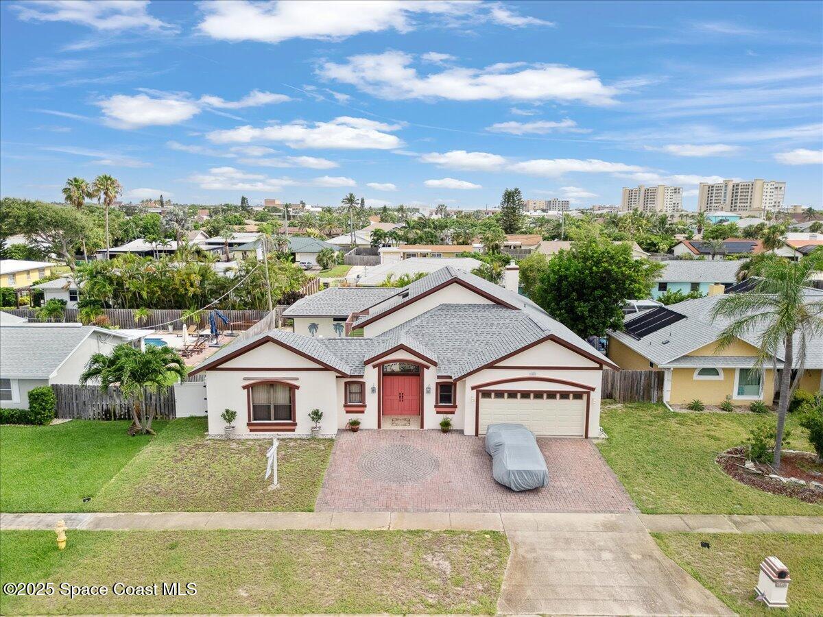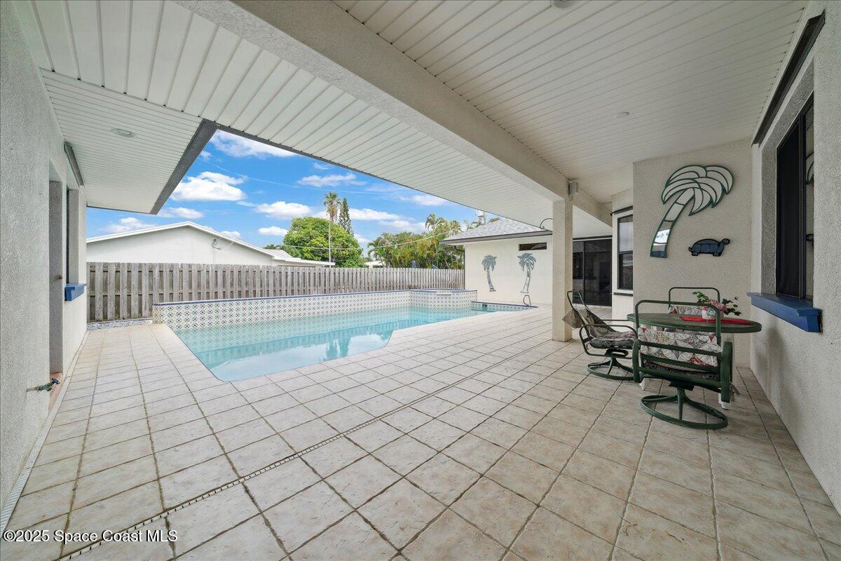 Just 1.5 blocks from the beach, this beautifully maintained 3-bed, 3-bath home offers the perfect blend of comfort & coastal charm. A 2nd-story loft with its own balcony—can easily be enclosed to create a 4th bedroom, ideal for growing families. The detached 1-bed/1-bath efficiency bungalow adds flexibility for multi-gen living or a private home office. Step into the serene courtyard featuring a large pool & spa, perfect for relaxing or entertaining. Inside, you'll find vaulted ceilings, open floor plan, & a primary suite with patio access, a walk-in closet, jetted tub, & separate shower. Built in 2000 w/concrete block construction, this home boasts recent upgrades: 2023 roof, 2024 A/C, & new water heater. Miami-Dade hurricane shutters offer added peace of mind. Located just blocks from top-rated schools, shopping, & dining, this one-owner home is a rare find in Satellite Beach. Whether you're seeking a family home or a second home by the sea, 240 Sheridan is ready to welcome you!
