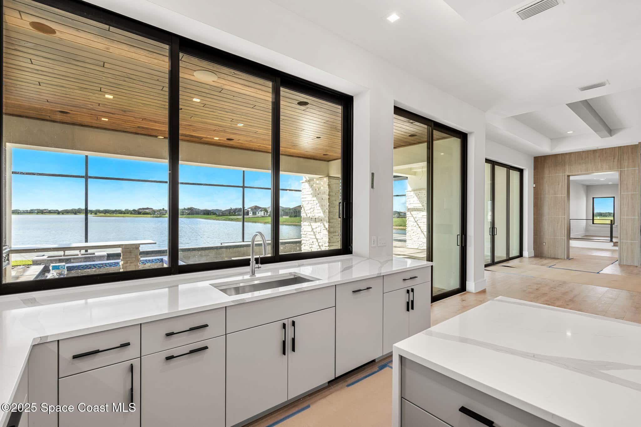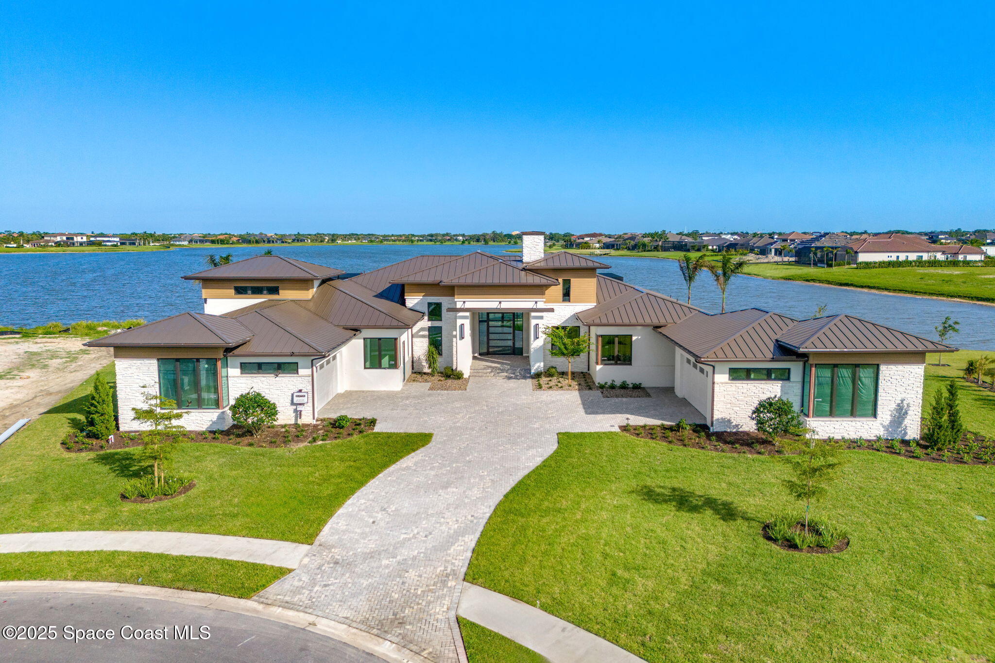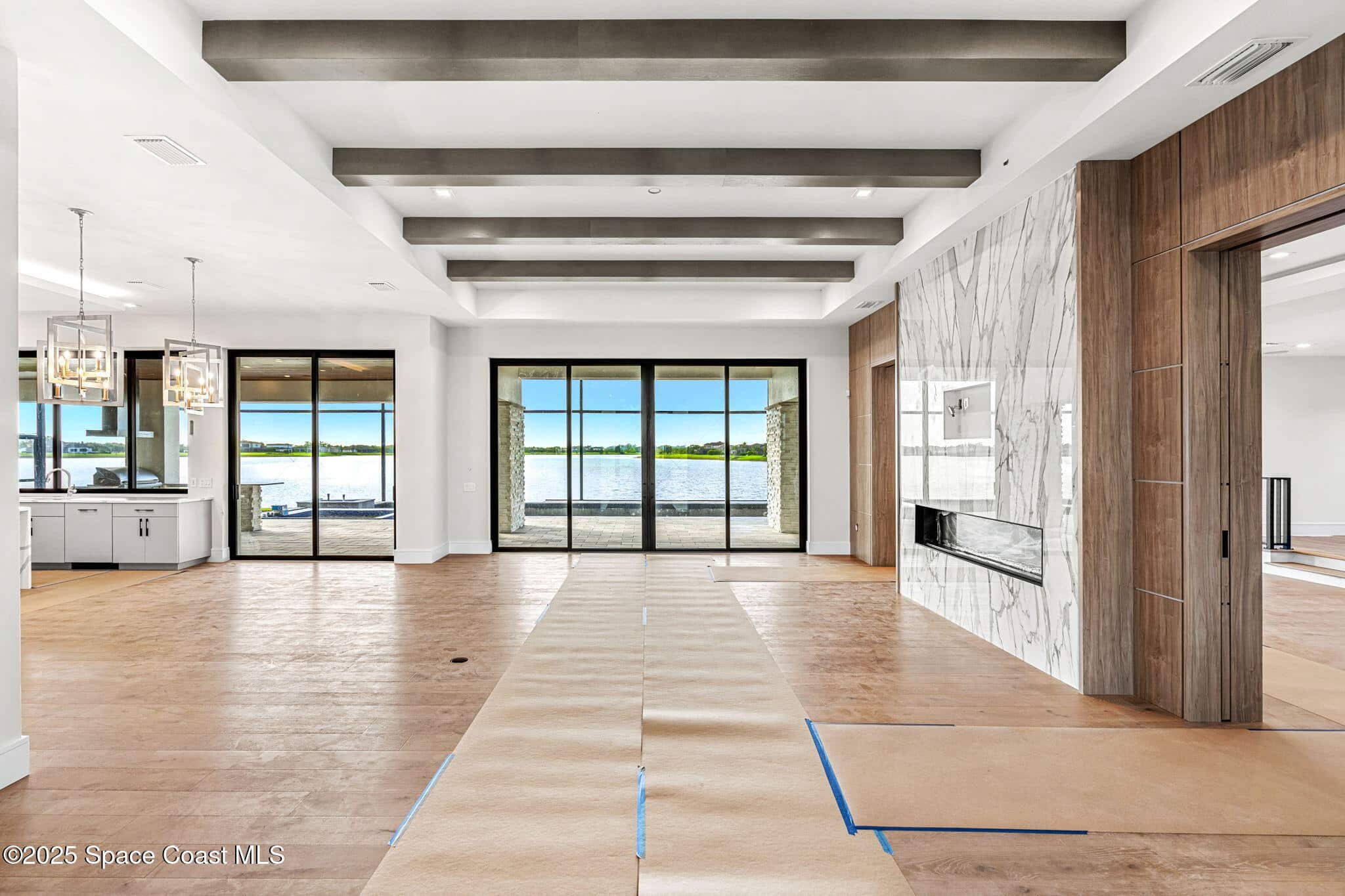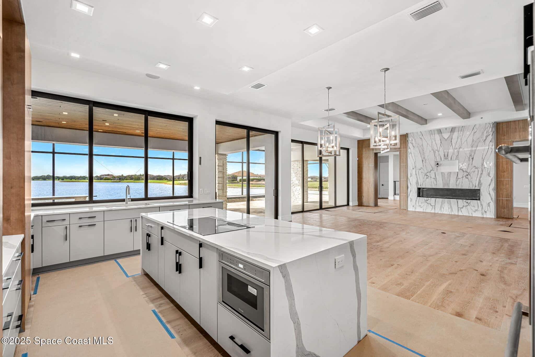 A masterpiece forged over two years of visionary artistry nears completion on Adelaide's most coveted lot, with sweeping views down Viera's grandest lake. Hardwood & rich tile floors lead to a magnificent great room, where a sleek electric fireplace anchors soaring ceilings. Disappearing sliders reveal a resort-worthy backyard oasis. The gourmet kitchen, a study in elegance, boasts marbled quartz, Thermador appliances, a butler's pantry, and an expansive island for lavish gatherings. A versatile flex room dazzles with dual pocket doors and a pool bath. The owner's suite, a serene escape, offers lanai access, a spa-inspired bath, and a celebrity-caliber closet with a hidden laundry passage. Outdoors, a vast saltwater pool, summer kitchen, and fireplace craft a timeless sanctuary. An air-conditioned Amazon delivery room and four-car garage elevate this estate to unrivaled perfection, leaving no desire unfulfilled.