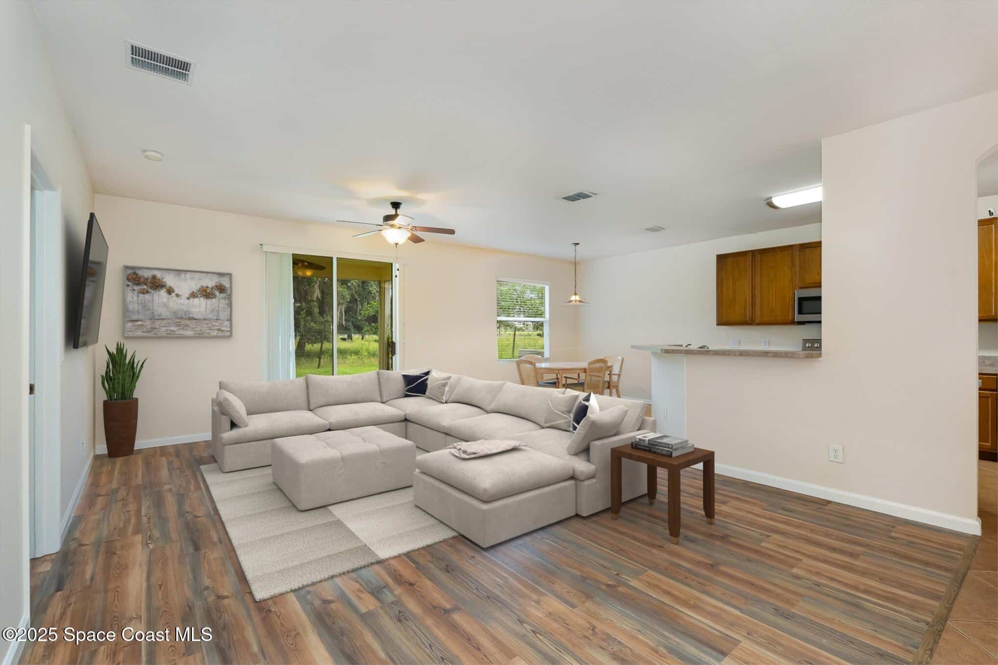 Offered is a clean and well-maintained 3-bedroom, 2-bath, 2-car garage concrete block home located in the desirable Fern Meadows community—just 2 miles west of I-95. Freshly painted inside and featuring a spacious open floor plan, this home is perfect for comfortable living and easy entertaining. You'll love the kitchen with stainless steel Samsung appliances and the brand-new carpet in two of the bedrooms. Step out back and relax on your patio as you take in the peaceful pasture views—complete with the occasional cow or two in the distance! The low HOA includes tennis courts, basketball courts, and a park near a nice pond. Ideally located for commuters, this home offers quick access to Orlando, the beaches in Cape Canaveral, Kennedy Space Force, and all points north and south via I-95. Priced to sell and truly move-in ready, this is a great opportunity to own in a quiet, established neighborhood. Priced to move, this home is a must-see. Schedule your private showing today!